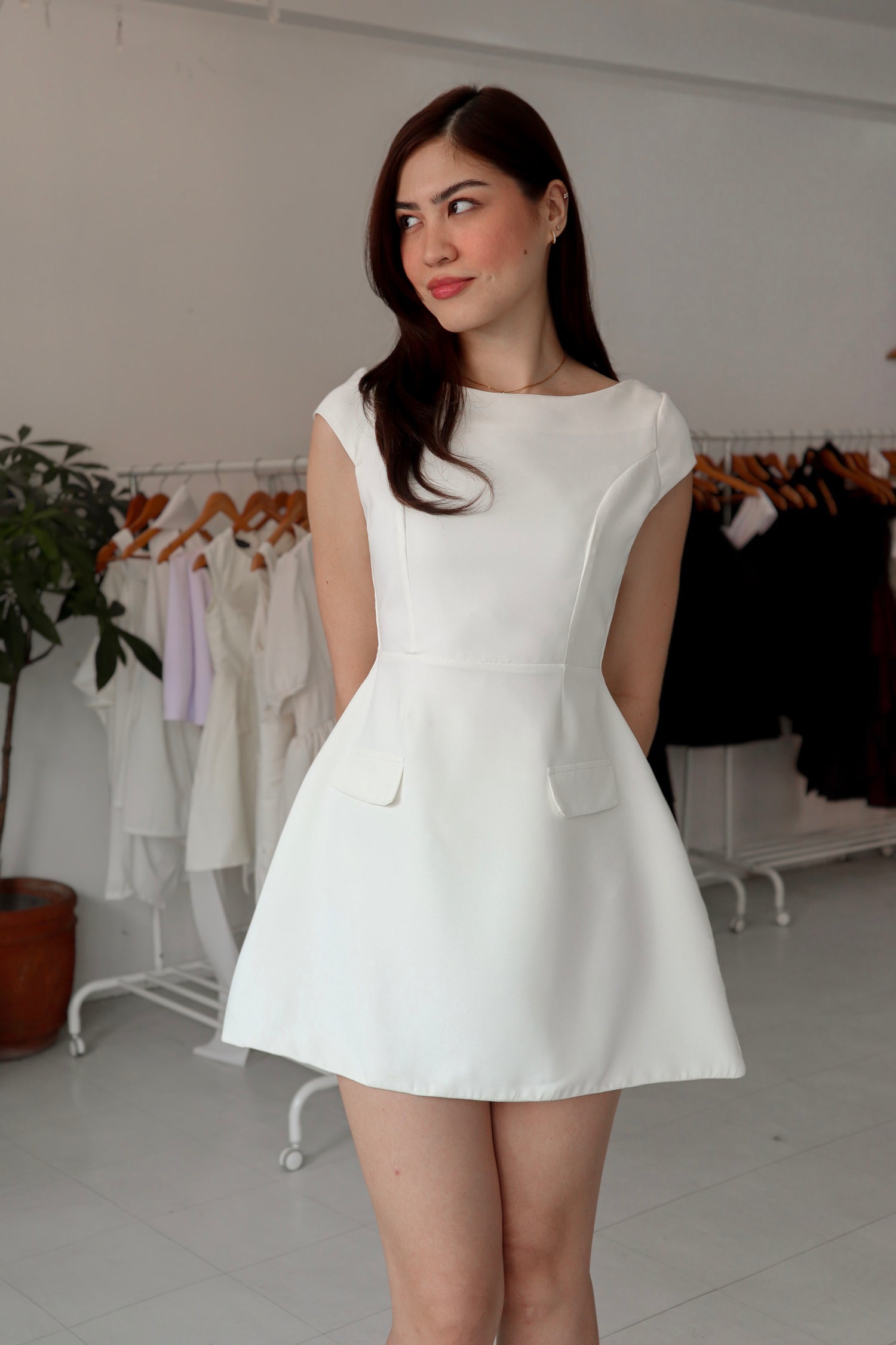 Modern structure meets timeless femininity in the Ayla Cap-Sleeve Mini Dress. Designed with a refined boat neckline and tailored cap sleeves, it frames the silhouette with clean, confident lines, while the softly flared hem adds a subtle touch of movement and charm.