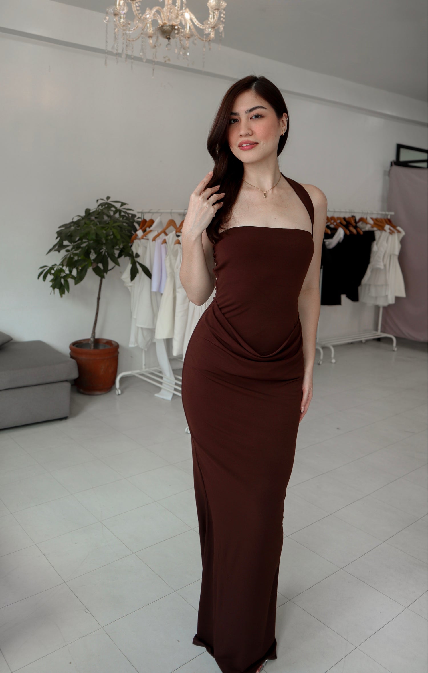 The Ebony Maxi Dress captures refined elegance with a modern, sculpted edge. Designed with a halter neckline that frames the shoulders and fastens with delicate buttons at the neck, the silhouette contours the body while fluid draping at the waist creates soft dimension and a flattering focal point. Crafted from stretch jersey fabric, Ebony moves effortlessly with the body, falling into a sleek maxi length that feels both dramatic and timeless—made for evenings where understated allure speaks the loudest.