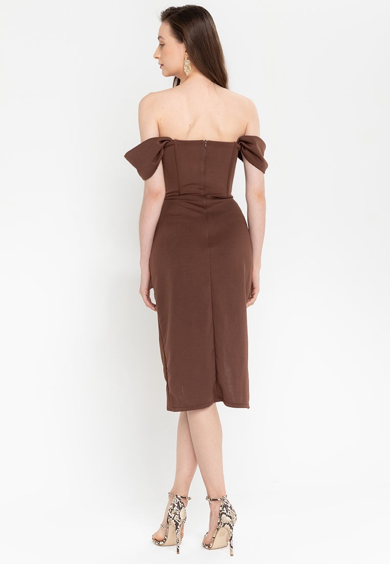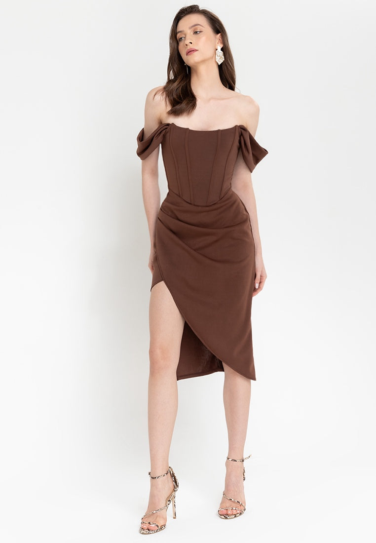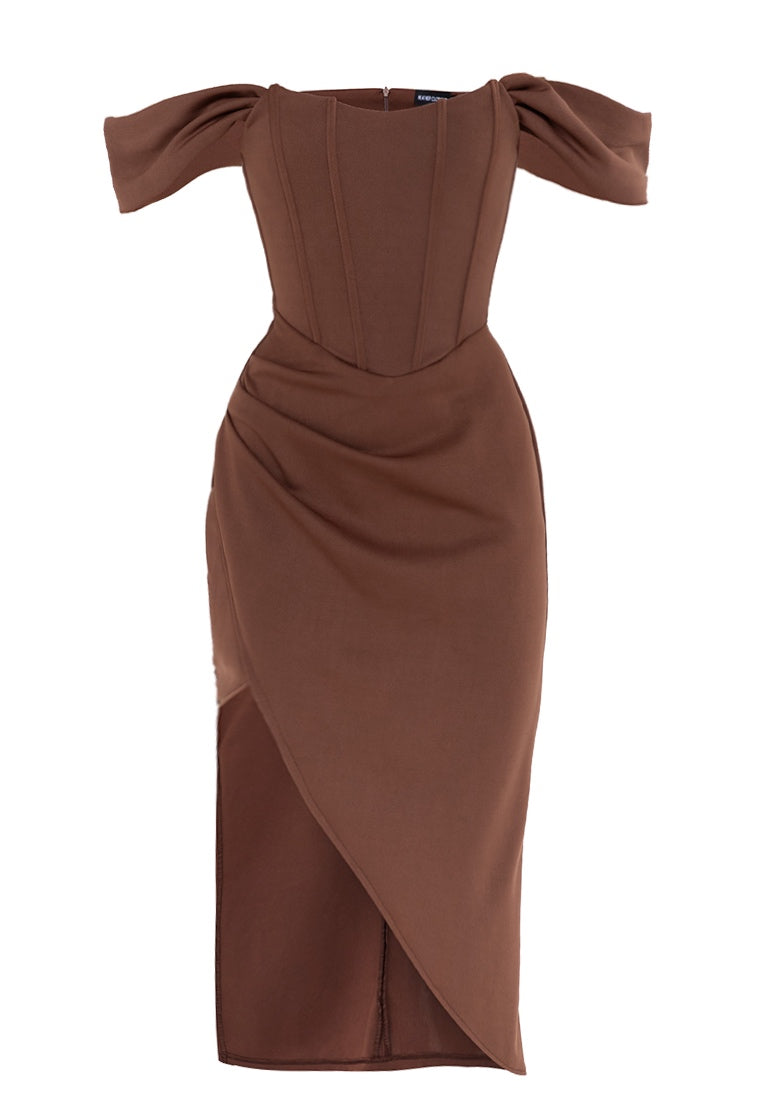 Off-The-Shoulder Corset Midi Dress in Chocolate