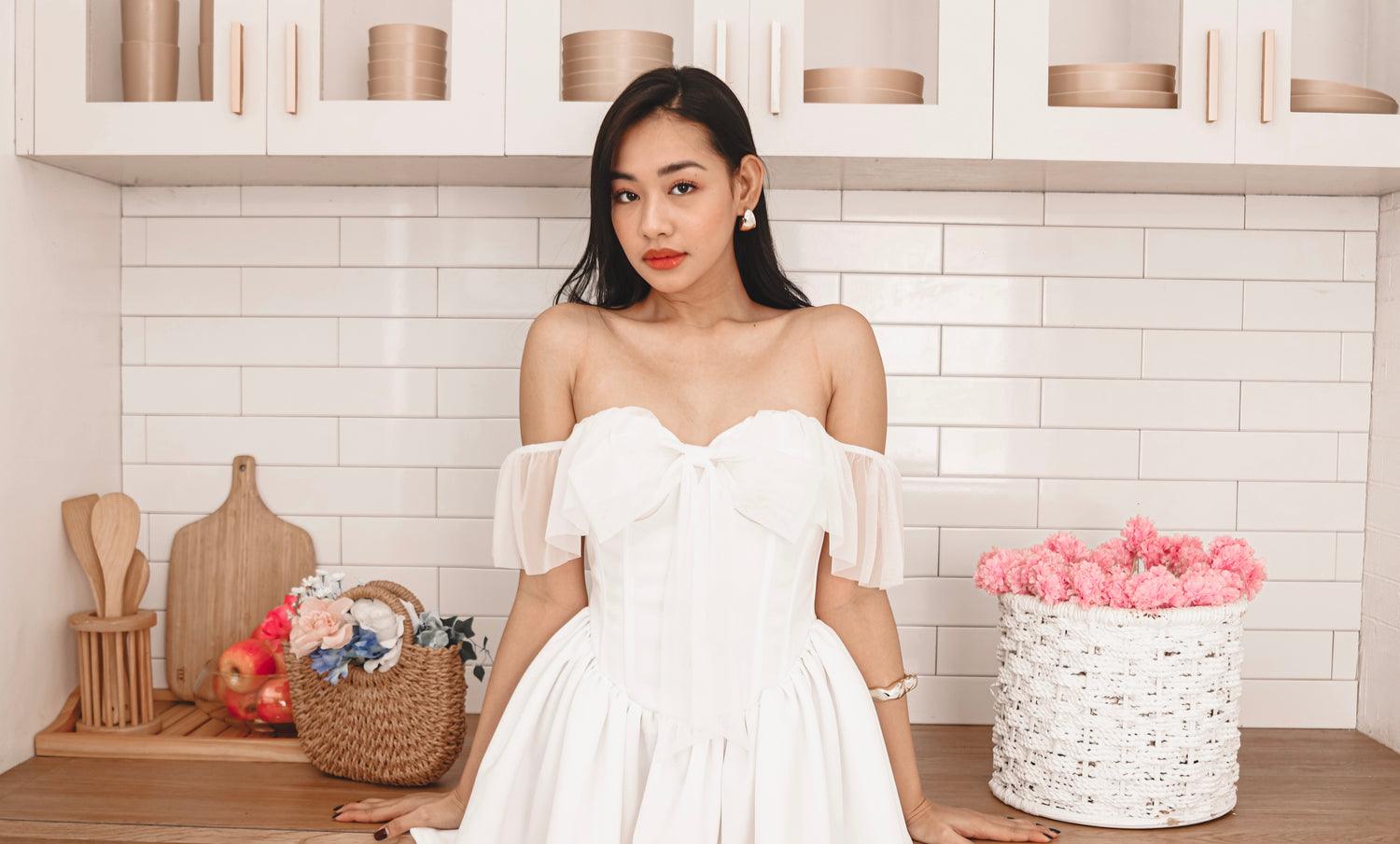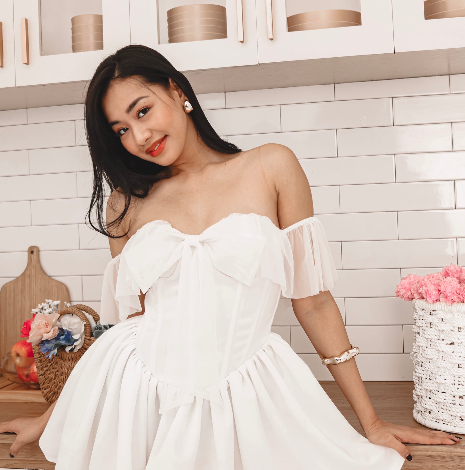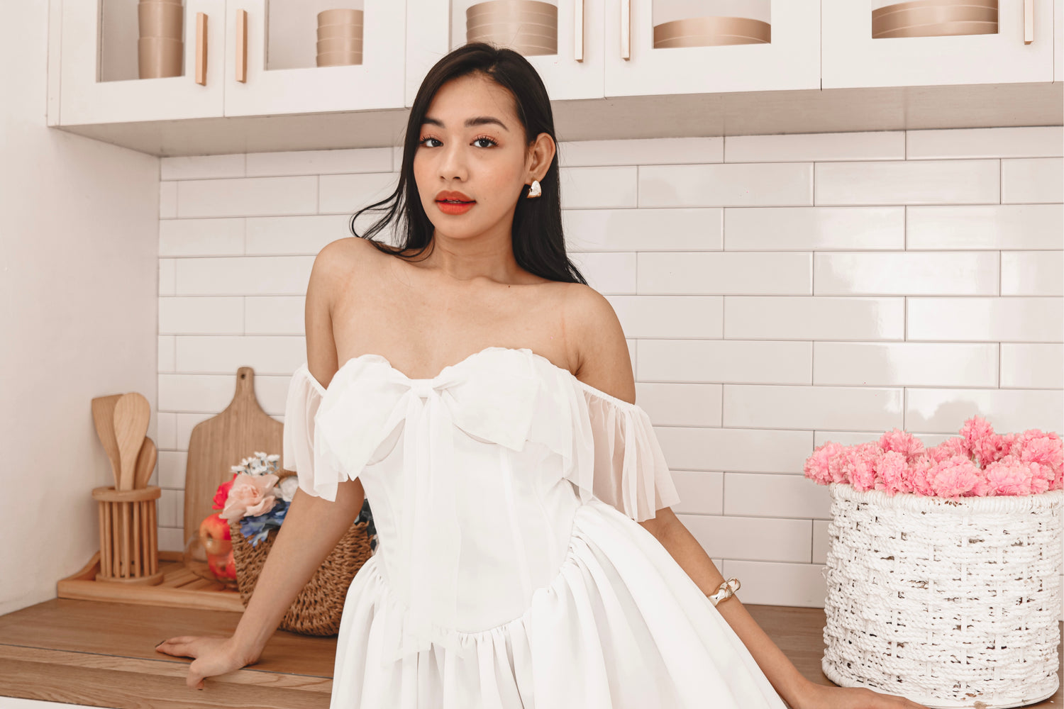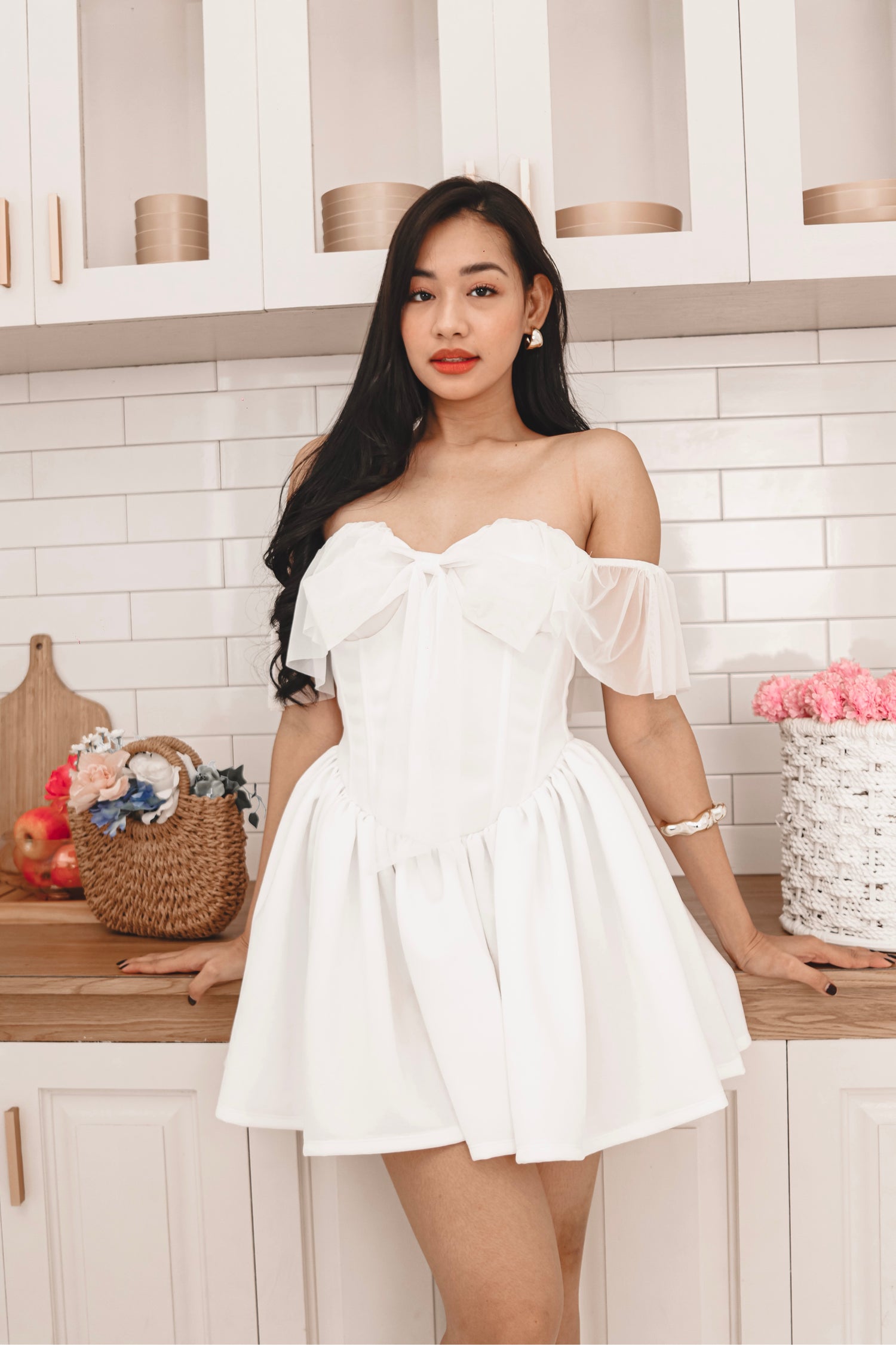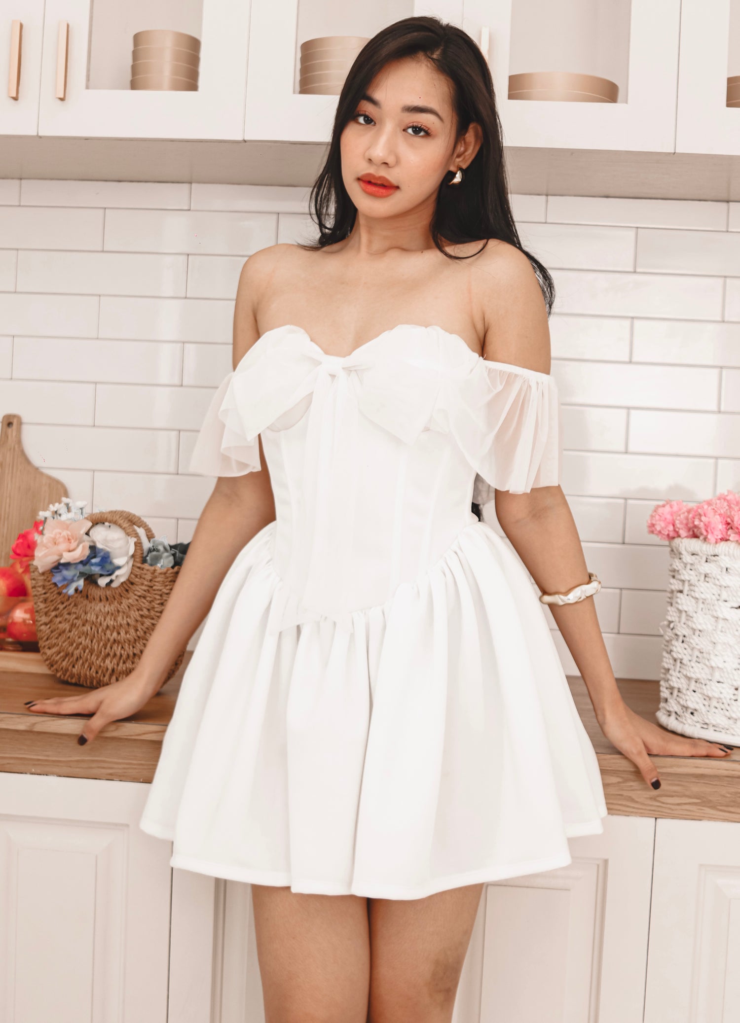 The Gwendoline Mini Dress captures timeless romance with a dreamy, feminine touch. Designed in a corseted silhouette, it features a boned bodice for sculpted support and a delicate sweetheart neckline adorned with a dainty bow detail. Soft ruffled off-shoulder sleeves frame the shoulders beautifully, while the voluminous gathered skirt adds graceful movement. With its ethereal charm and structured elegance, Gwendoline is a piece made to enchant—perfect for moments that feel like a dream.