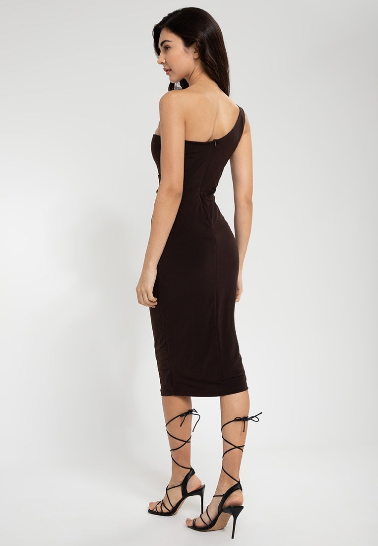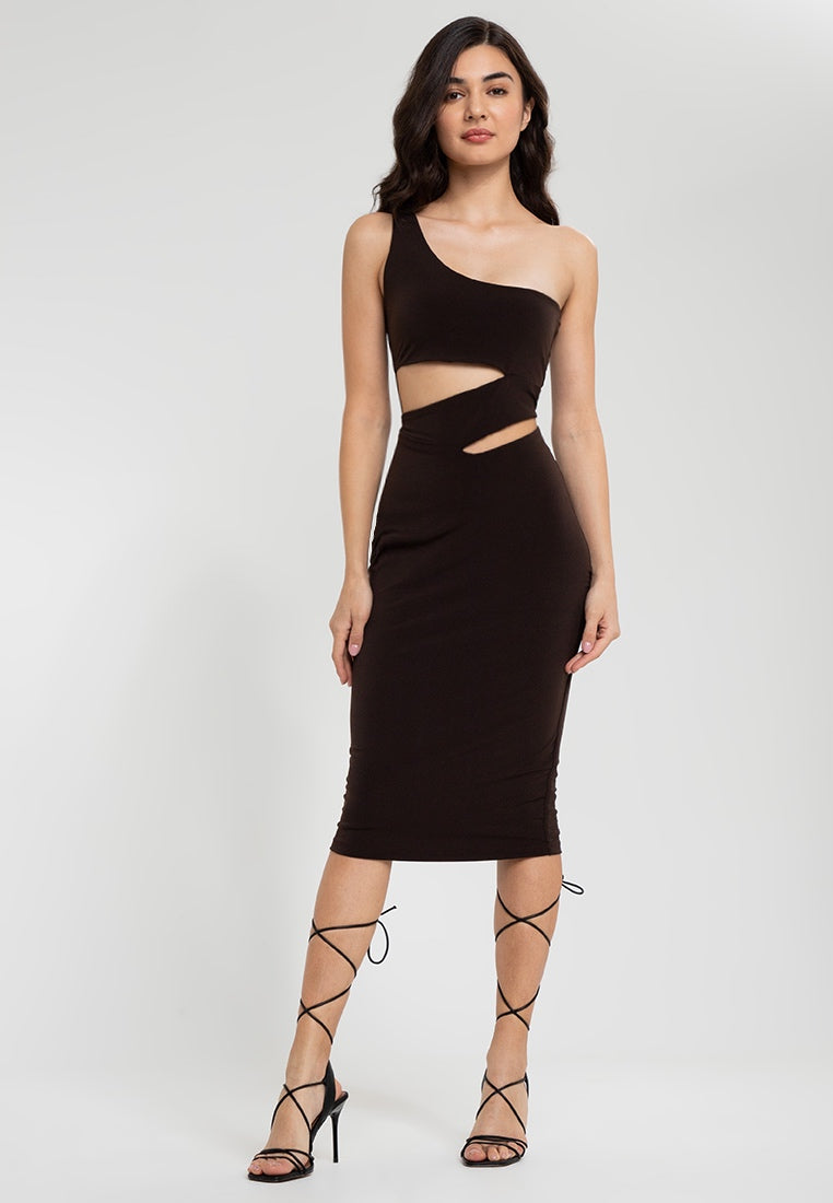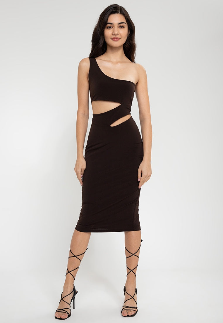 Chic, sleek and undeniably sexy, Hailey is a statement piece for your eventwear wardrobe. Cut to a dramatic midi length in our premium slinky jersey fabric, Hailey features an asymmetric neckline and statement cut out detailing around the waist that creates an alluring silhouette.