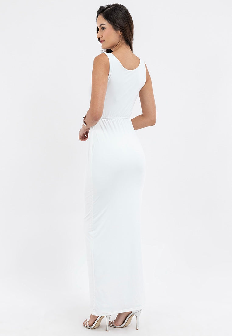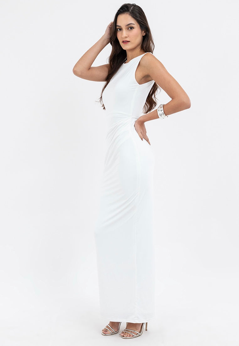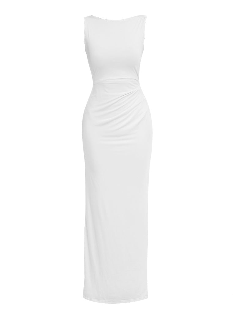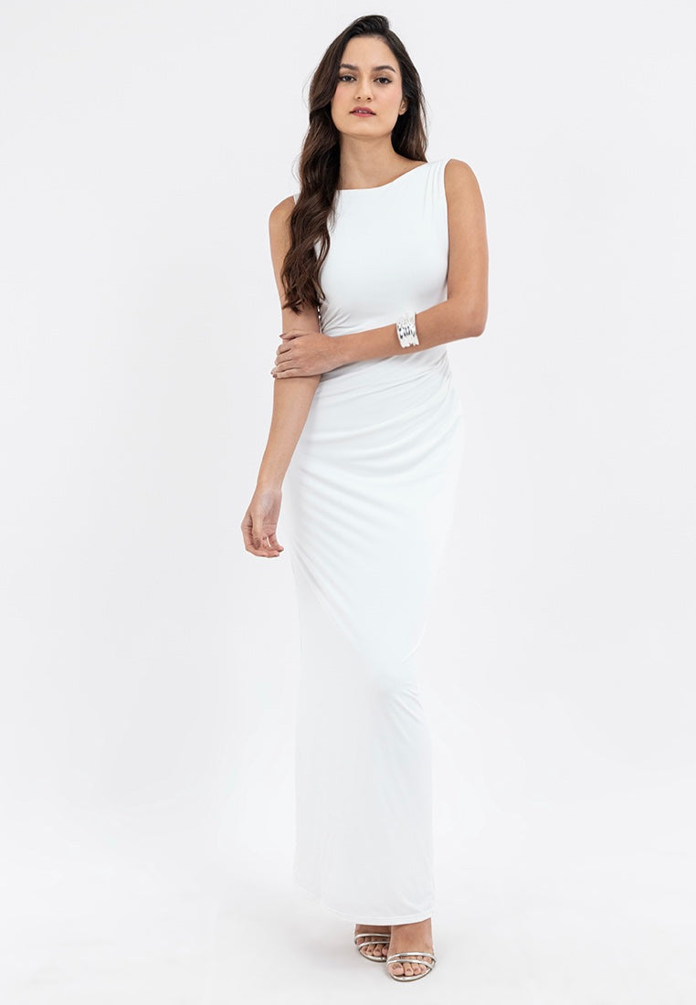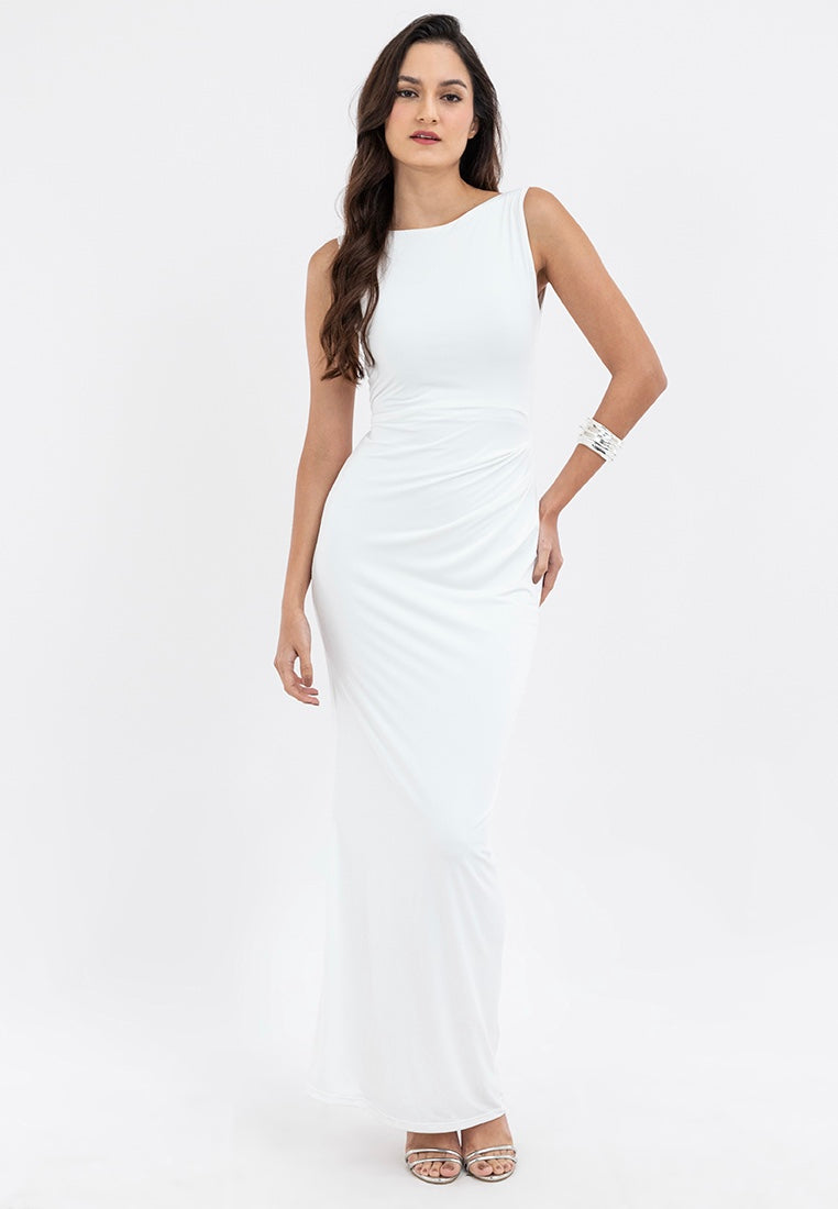 The Jemima Maxi Dress is a masterclass in understated elegance. Crafted in a slinky, fully lined fabric that skims the body, it features a refined boat neckline and a flattering bodycon silhouette. Gentle draping at the waist adds subtle allure, creating graceful movement and shape. Timeless and versatile, this piece transitions effortlessly from elegant evenings to modern bridal moments and elevated casual affairs