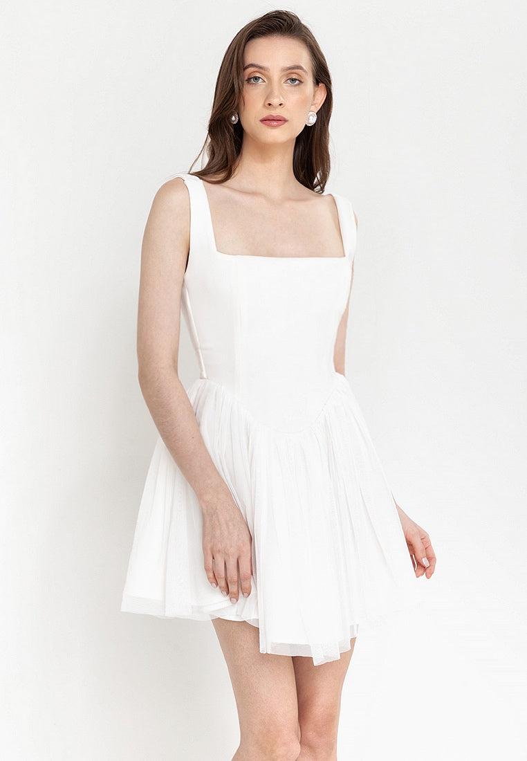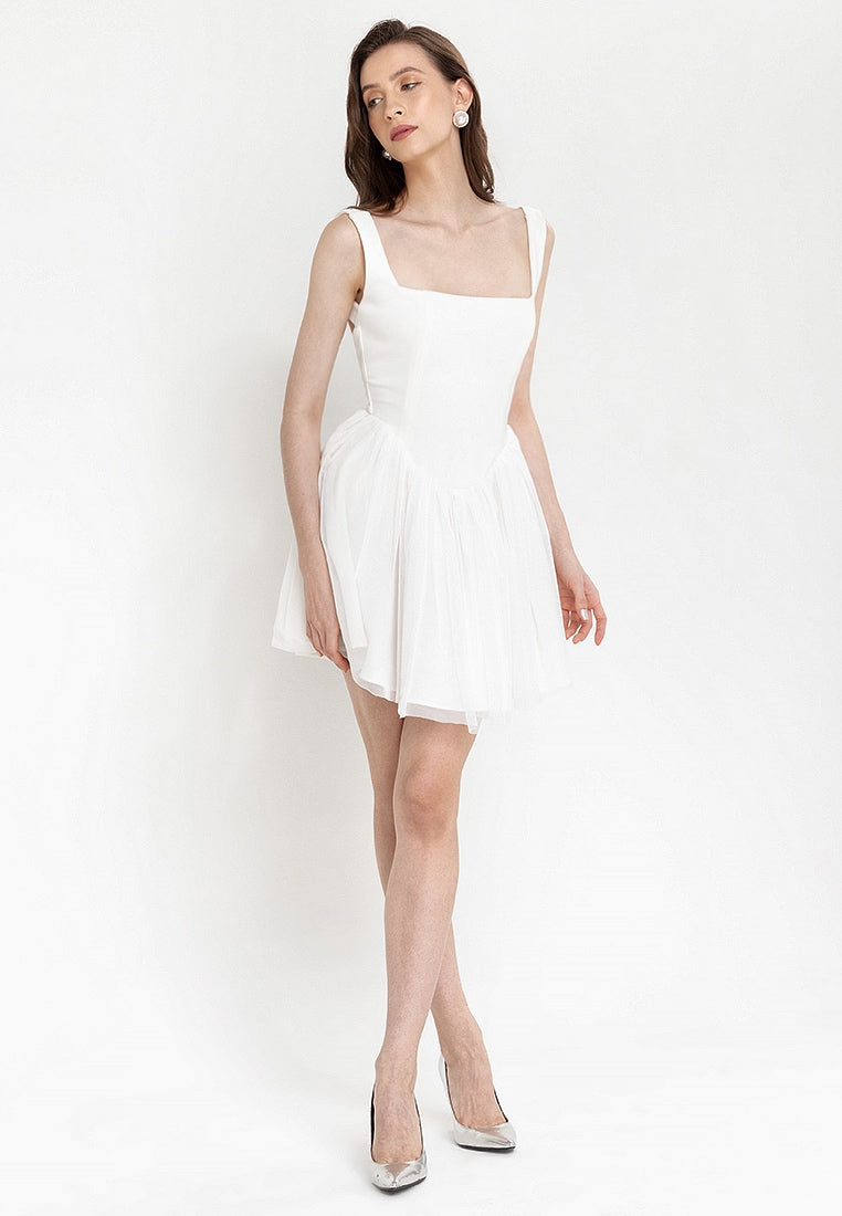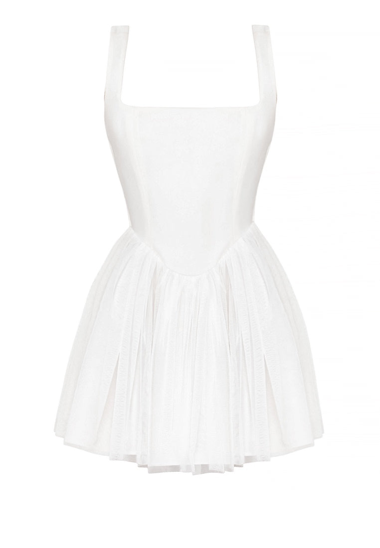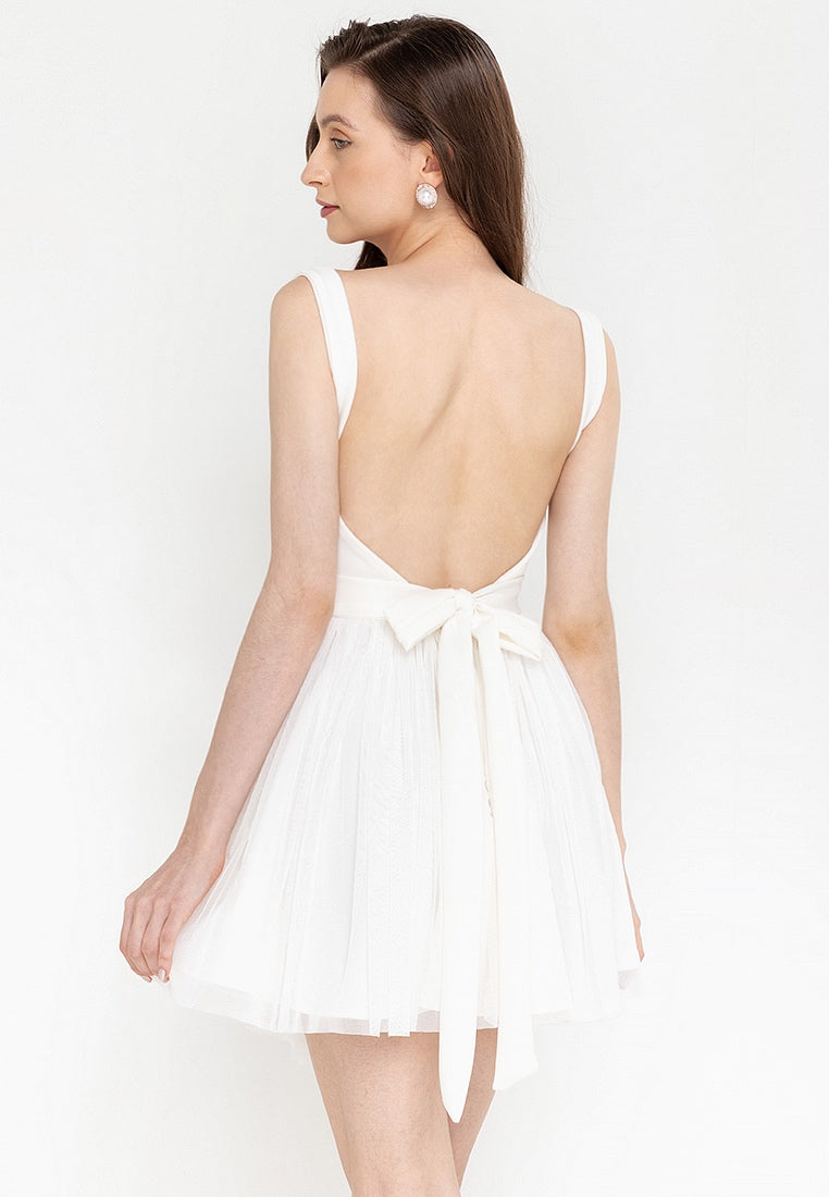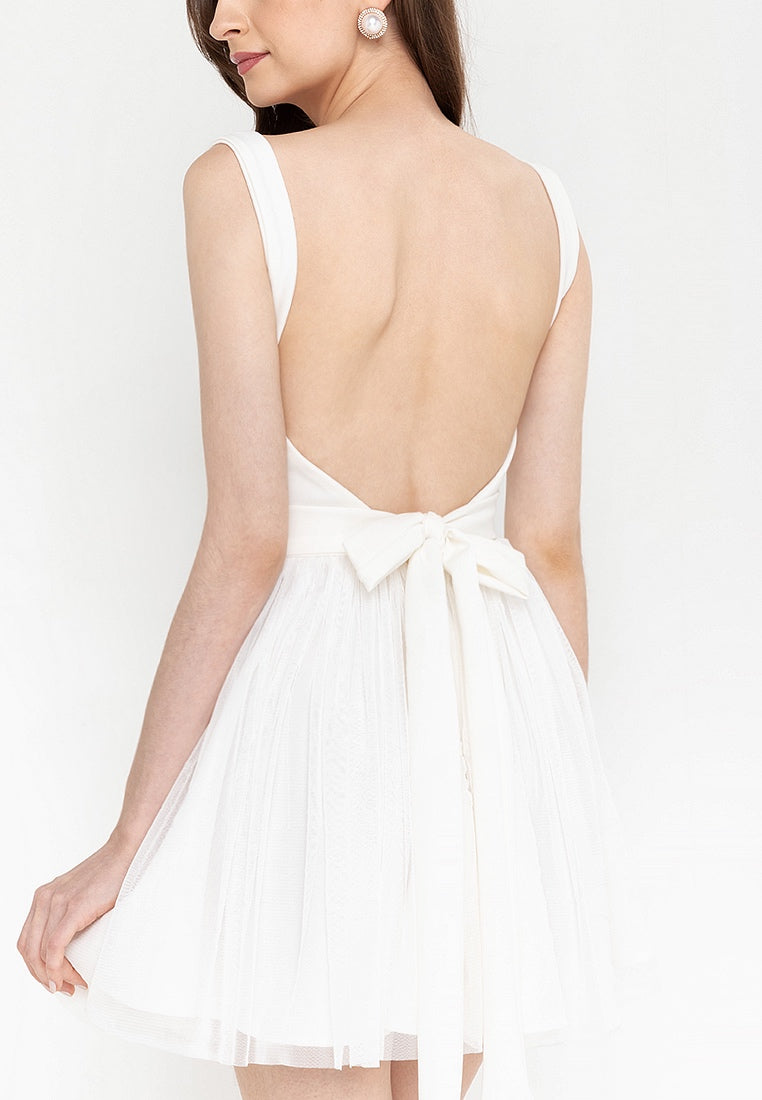 Our KLEIR mini dress has the prettiest silhouette. Soft and feminine, it features a corseted bodice and an open back complete with an self-tie bow for feminine drama. We love the figure defining seams and KLEIR has a pretty voluminous skirt that's fitted with a tulle fabric to hold the shape perfectly