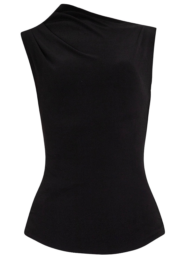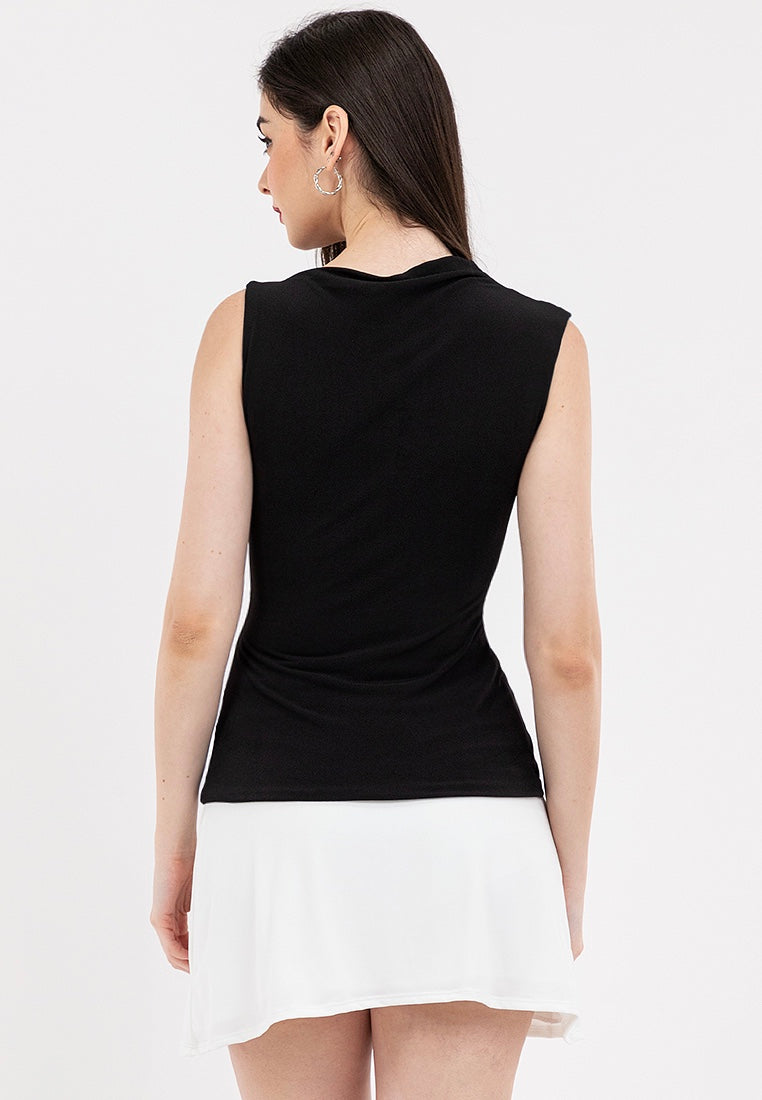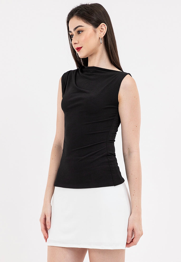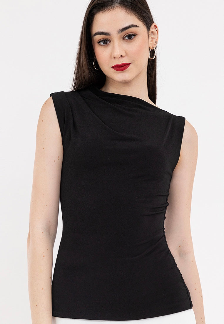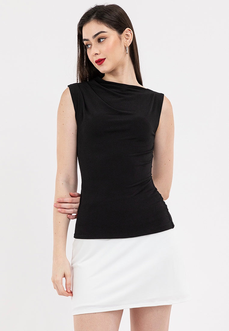 LORA is a sleek sleeveless top that redefines minimalist style. Featuring a high neckline, ruched shoulder detail, and wide shoulders, it creates a strong, flattering silhouette. The longline cut adds length and polish—perfect for effortless, modern dressing.