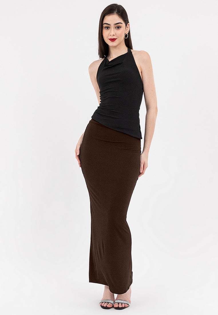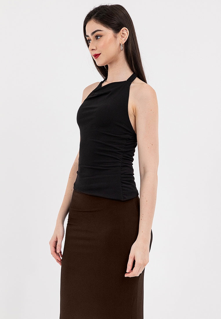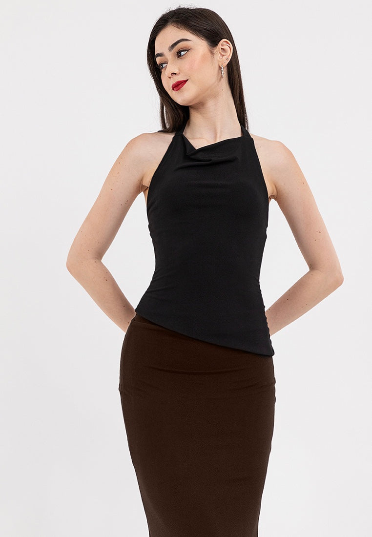 PRIYA is a standout halter top that exudes effortless glamour. Featuring a draped cowl neckline and open back, it highlights the shoulders with a touch of allure. The asymmetrical hem adds a modern edge, making it perfect for nights out or special occasions. Style it with denim for a casual-chic look or pair it with a skirt for a more dressed-up vibe.