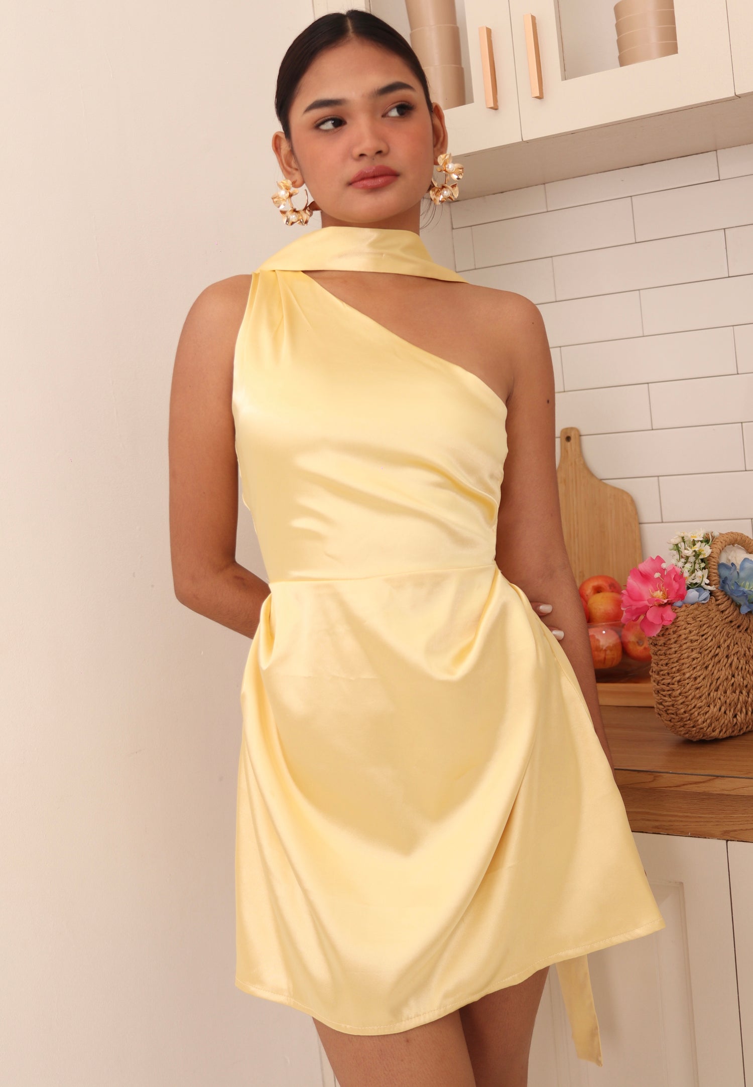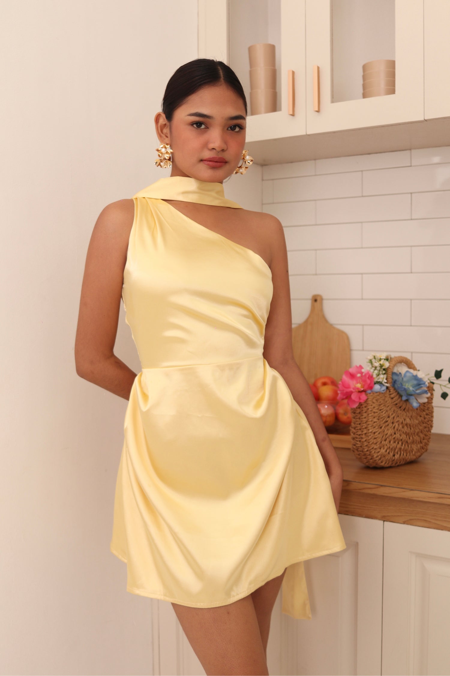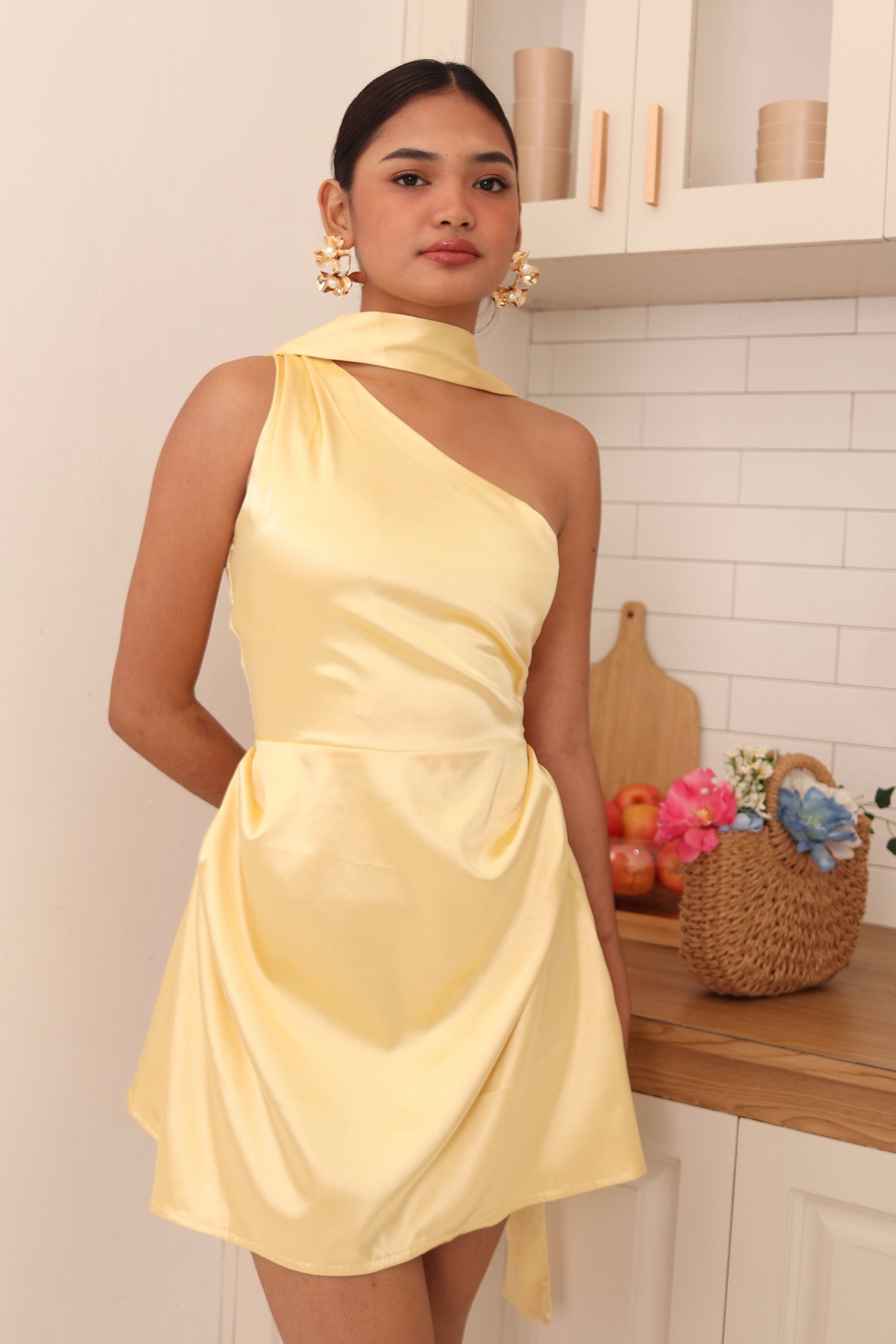 The Sabina Mini Dress ensures you’re the best-dressed this season. Rendered in a radiant yellow hue, it’s crafted from soft charmeuse silk in an asymmetric one-shoulder silhouette that feels both modern and timeless. Gentle side draping creates a fluid, playful movement through the skirt, while the attached matching neck scarf offers versatile styling options. Sabina is the perfect balance of polish and ease—made to shine at any occasion.
