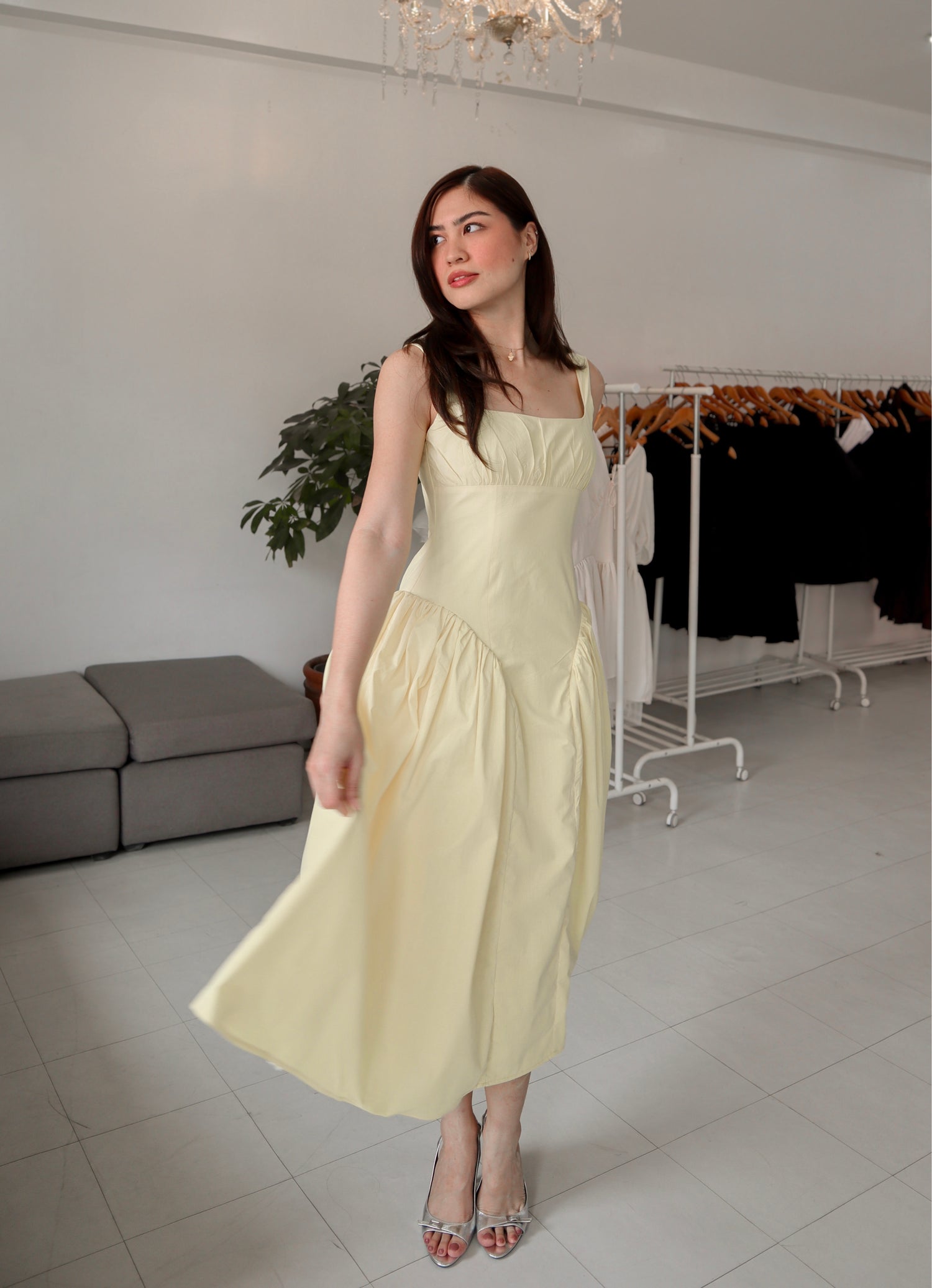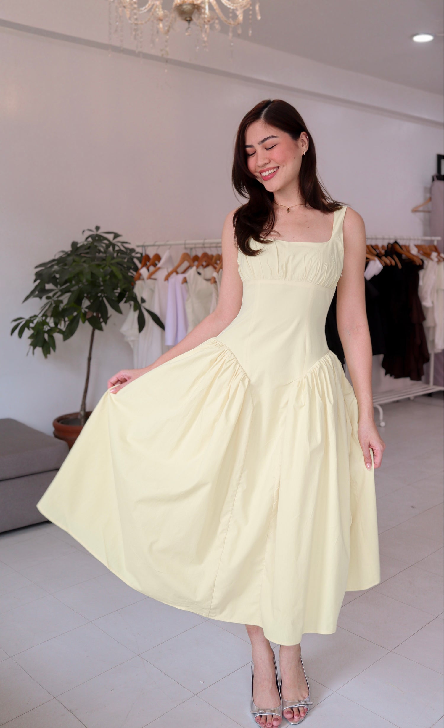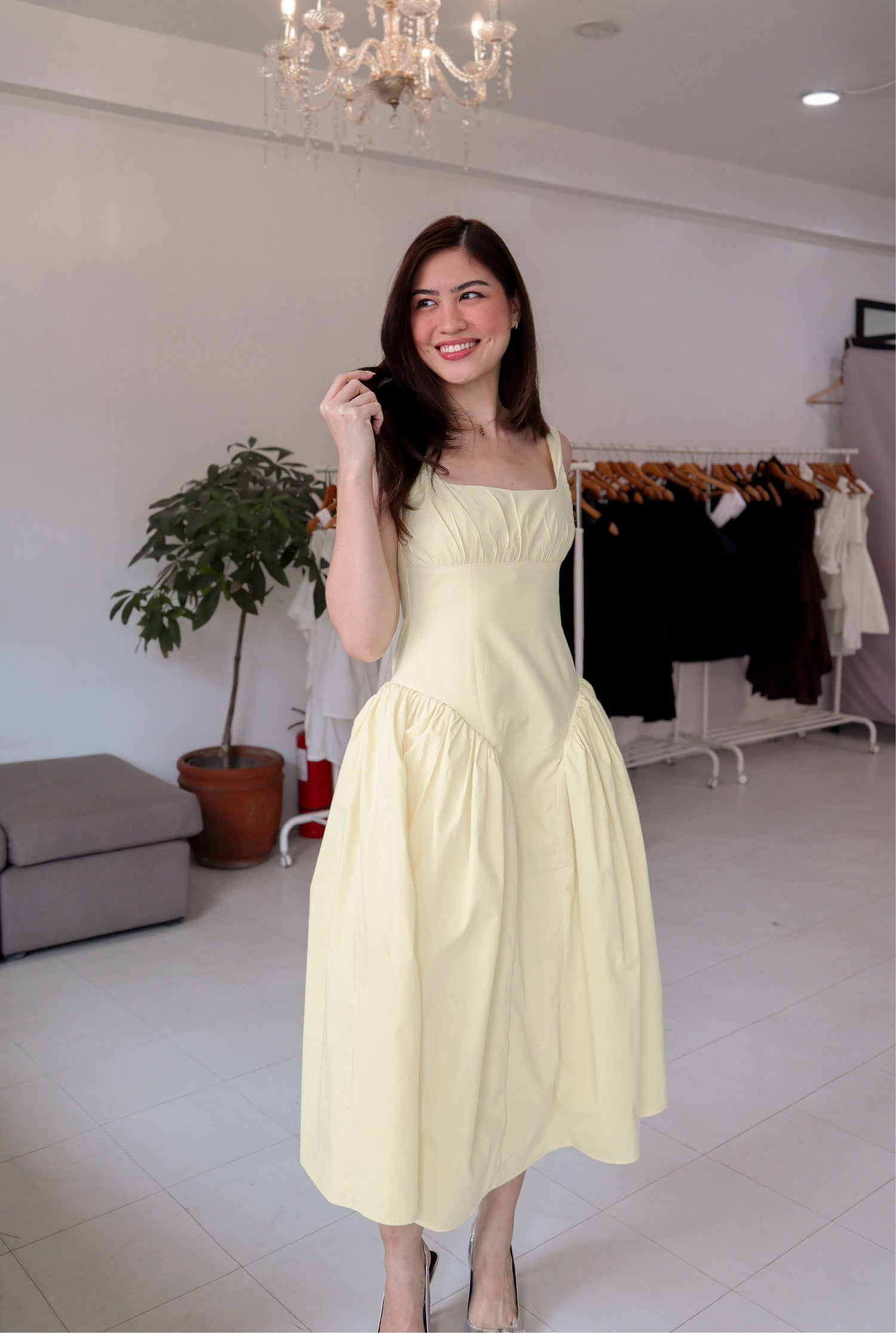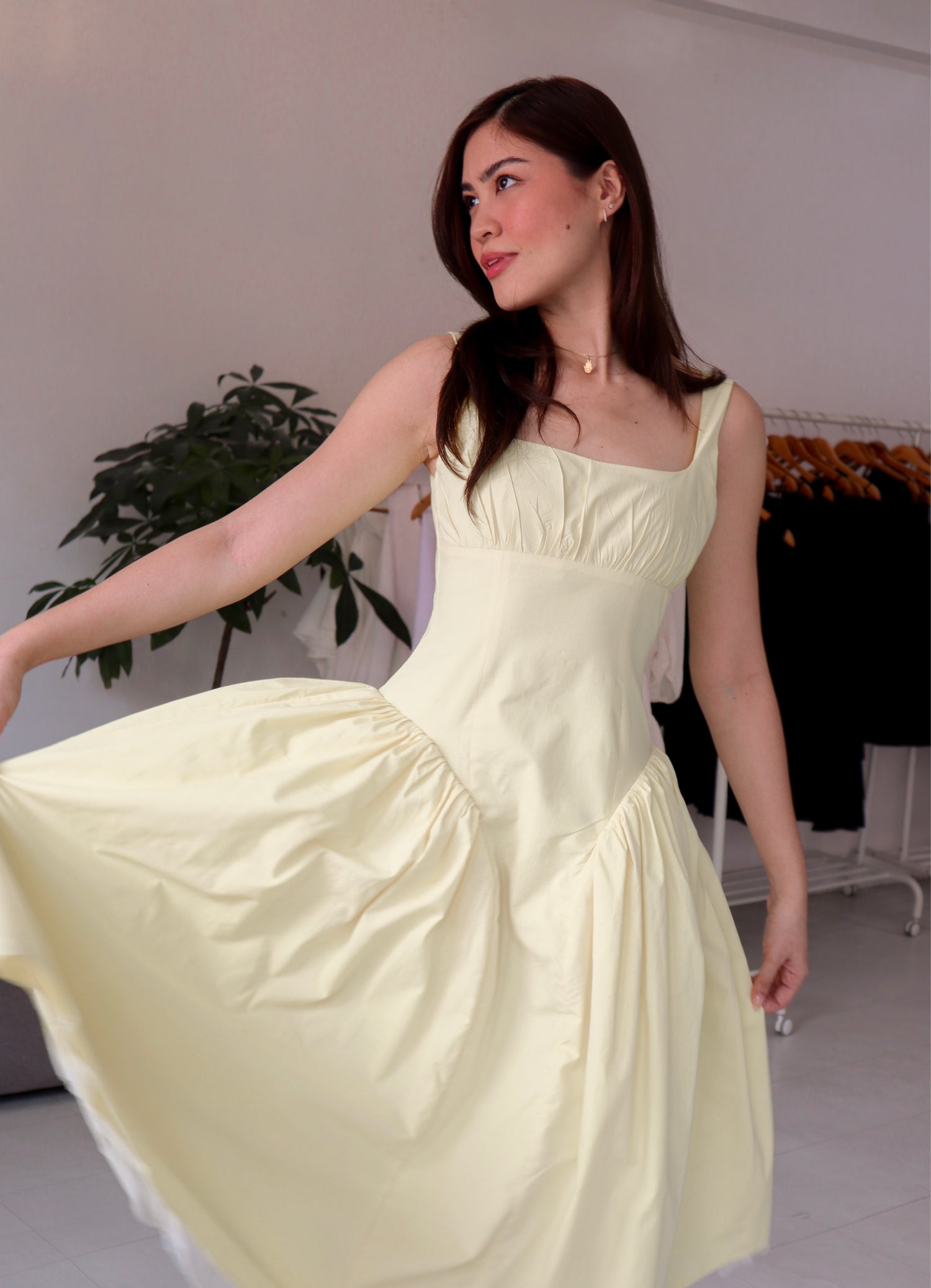 summer dressing, blending soft structure with effortless ease. Designed with a flattering square neckline and a shirred bust that gently sculpts and supports, the silhouette flows into a drop waist and gathered skirt that creates natural movement with every step. Crafted from breathable cotton poplin and fully lined for comfort, Susie is finished with subtle volume from a tulle petticoat and a discreet side zipper—making it perfect for sun-lit days, relaxed occasions, and elevated everyday moments.