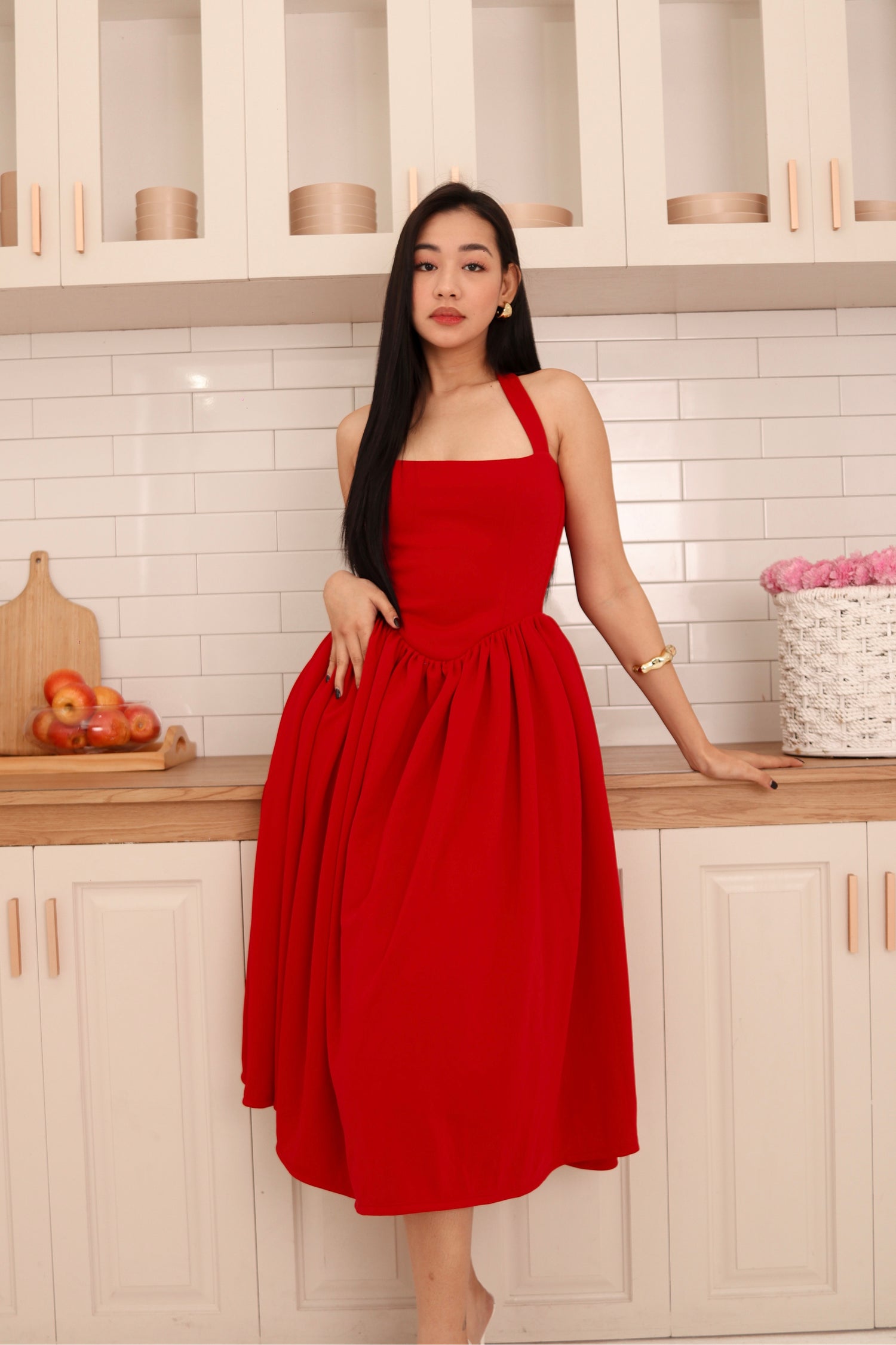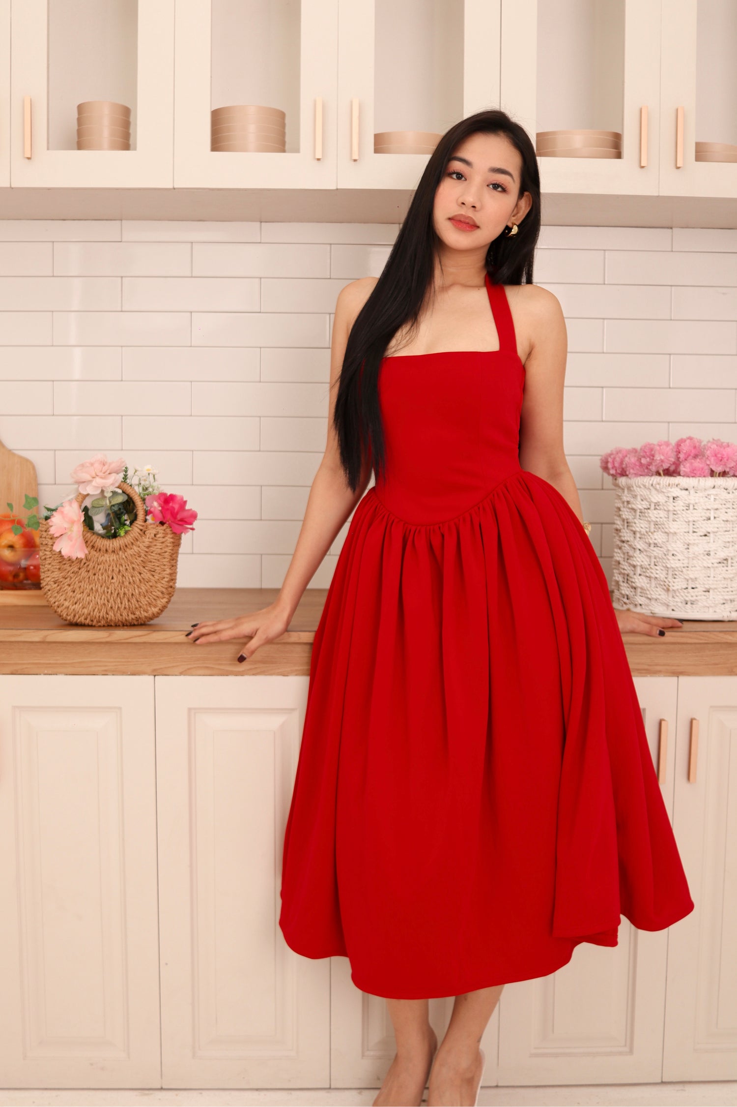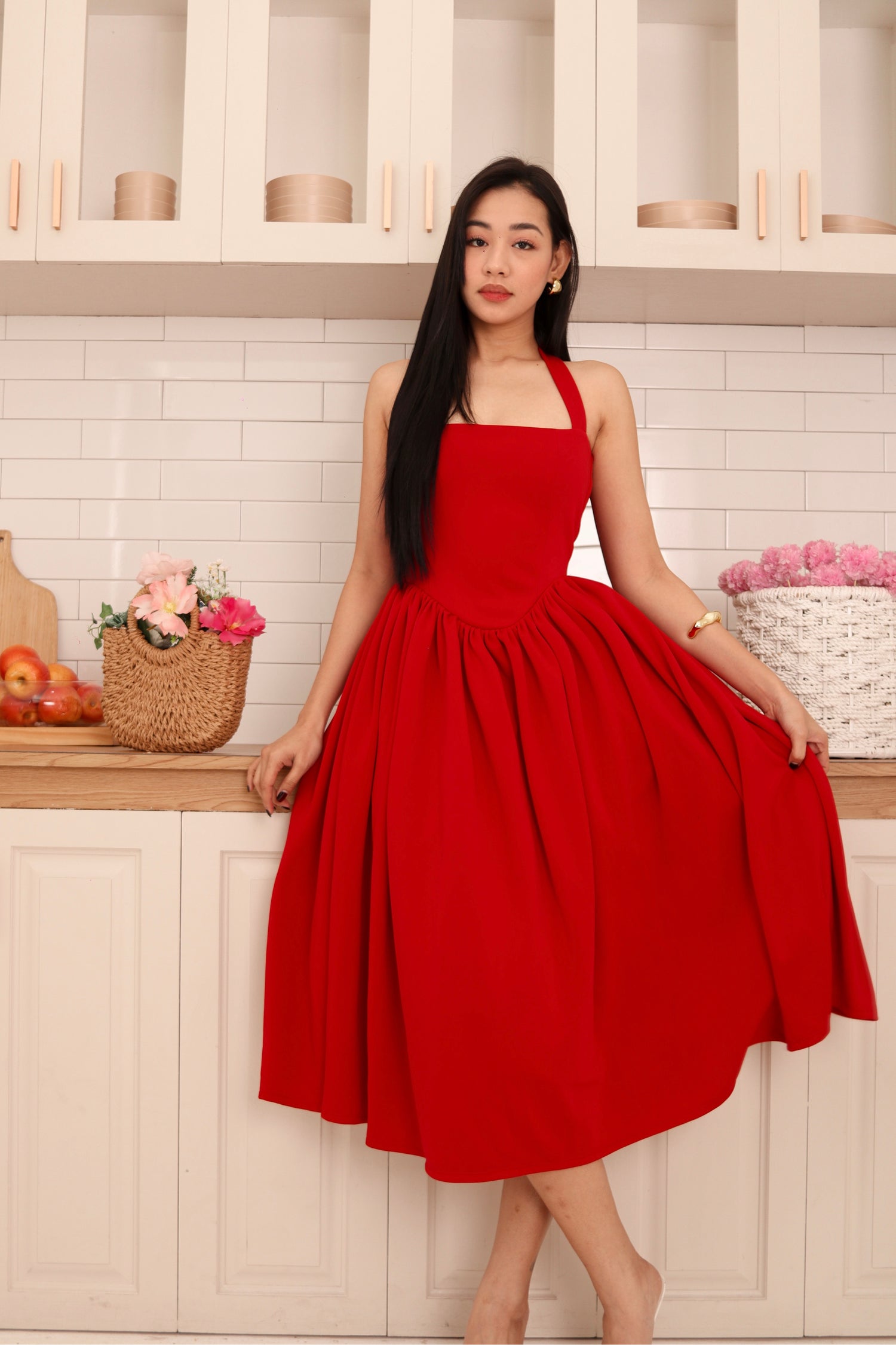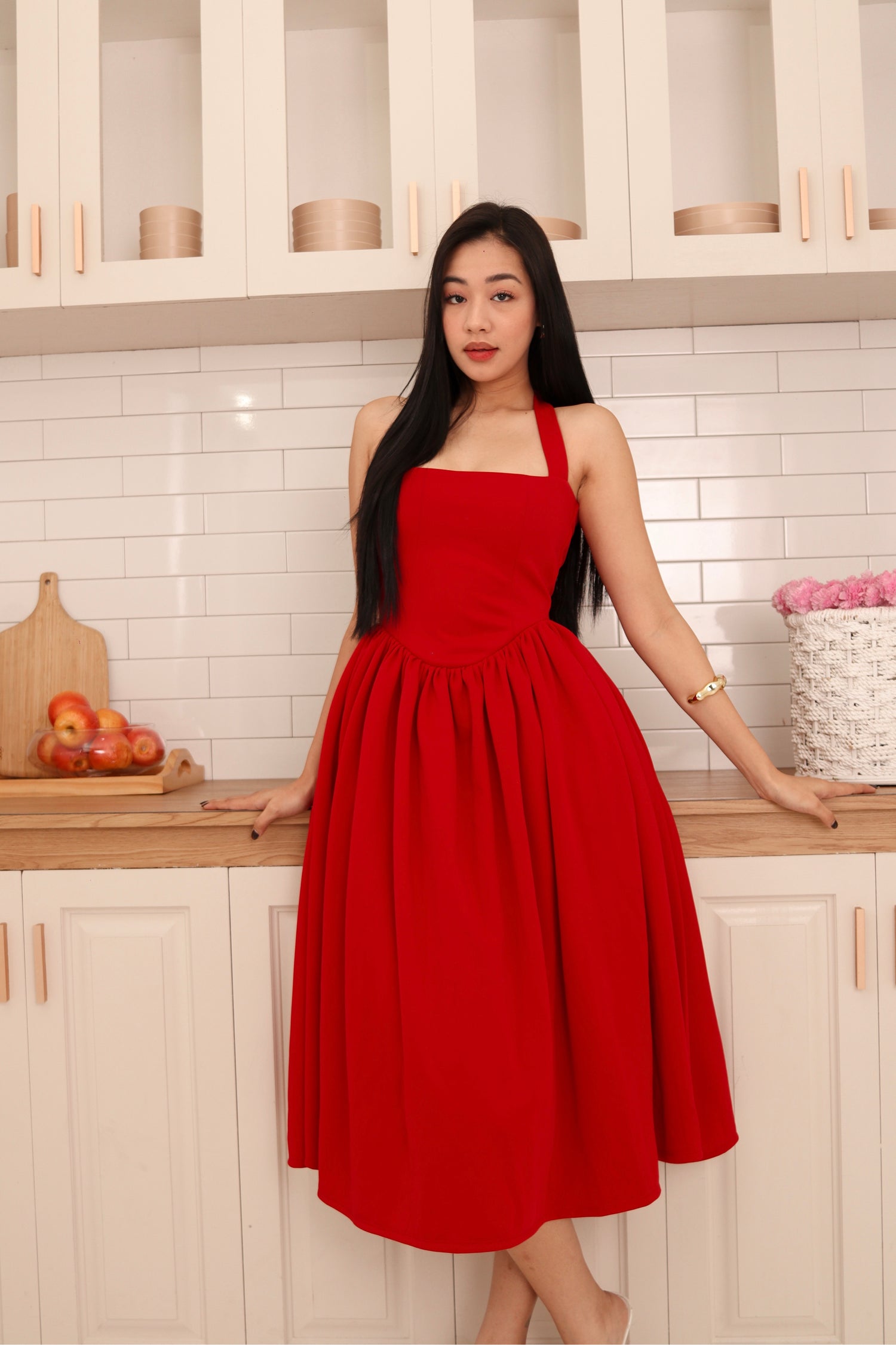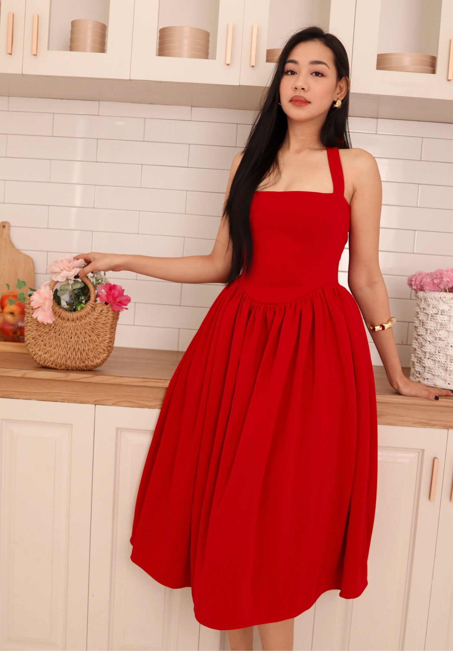 The Tove Midi Dress exudes classic romance with a modern edge. Designed with a corset-inspired drop-waist bodice and a graceful full skirt, it creates a beautifully balanced silhouette. The straight neckline is framed by adjustable halterneck straps for a customizable fit, while a built-in tulle petticoat adds soft volume and subtle drama. A timeless piece made for moments that call for quiet elegance.