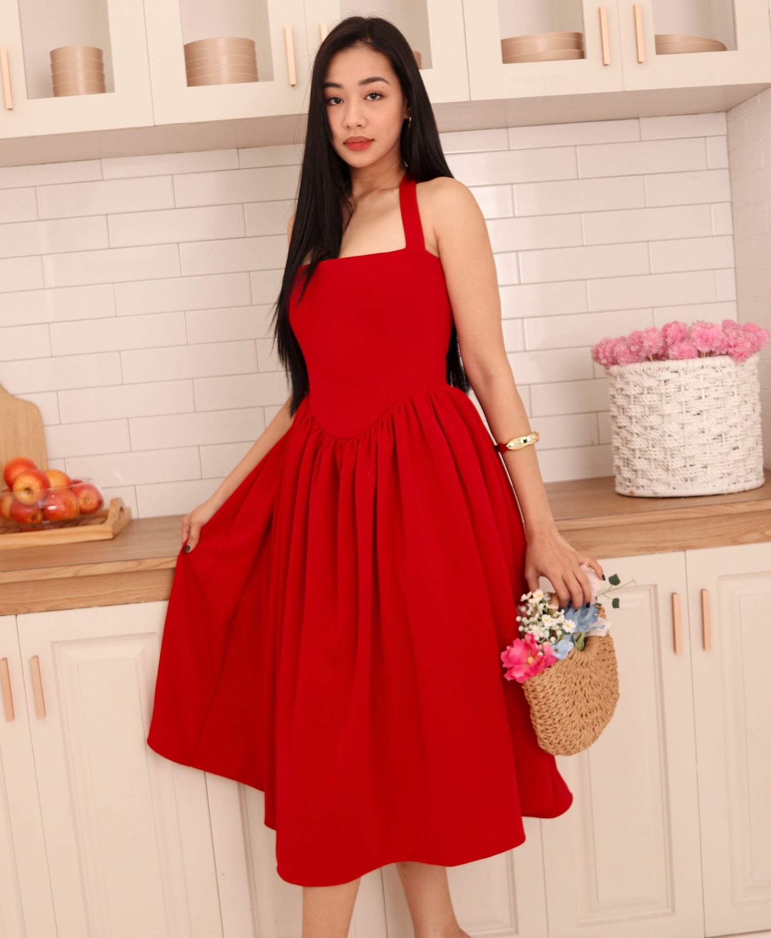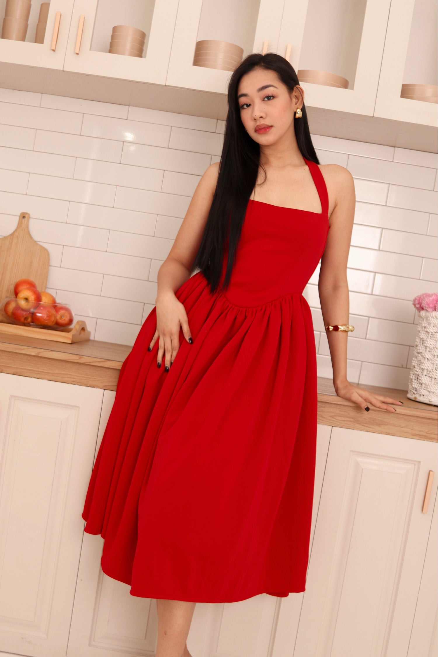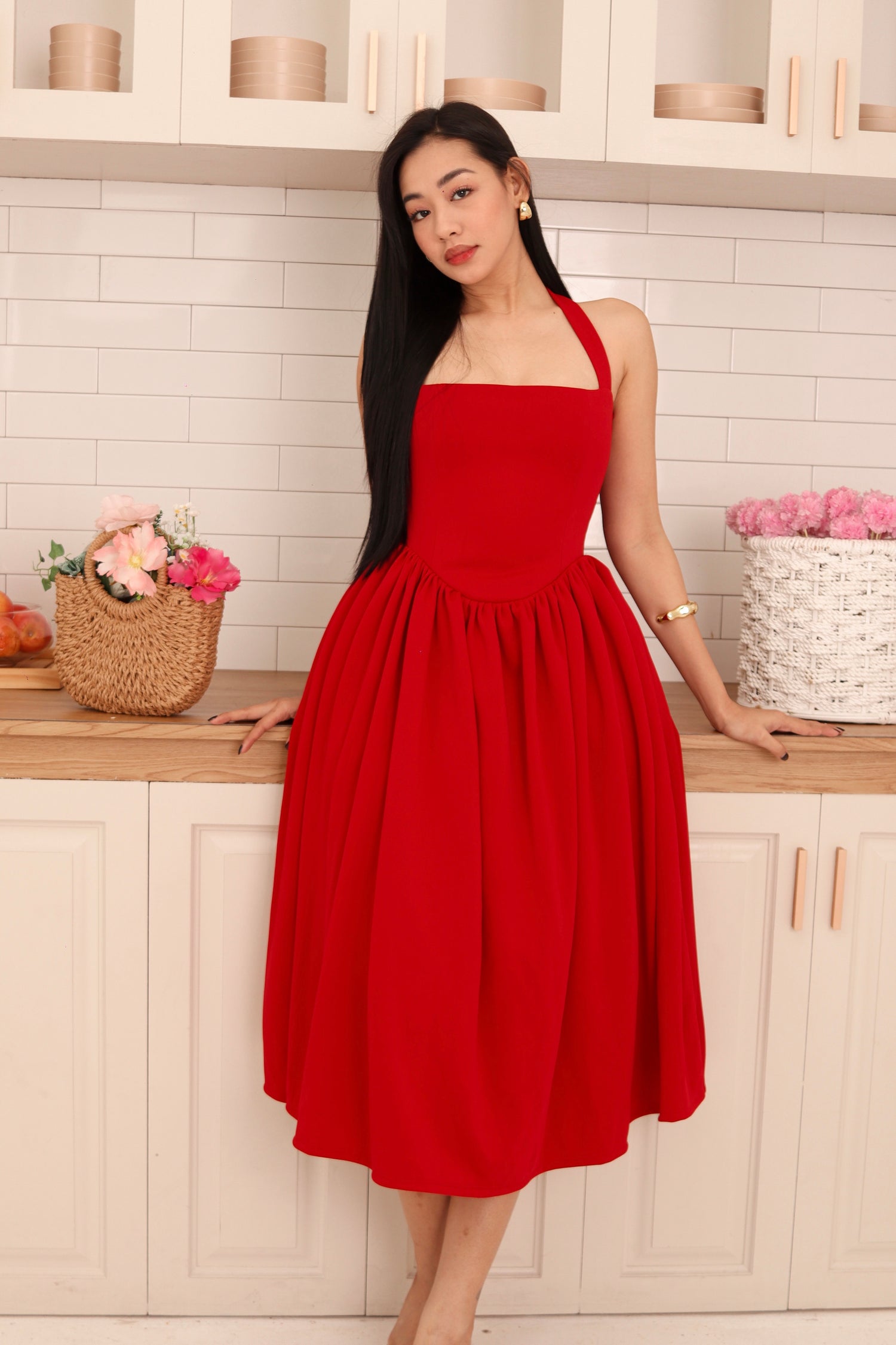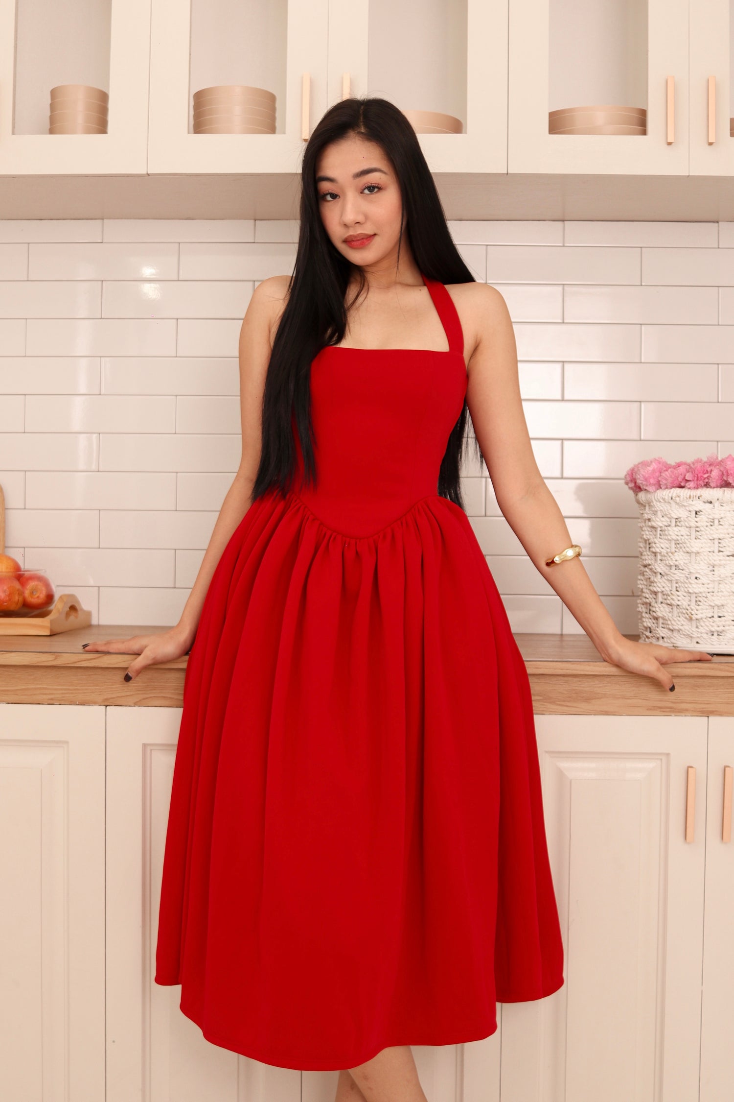 The Tove Midi Dress exudes classic romance with a modern edge. Designed with a corset-inspired drop-waist bodice and a graceful full skirt, it creates a beautifully balanced silhouette. The straight neckline is framed by adjustable halterneck straps for a customizable fit, while a built-in tulle petticoat adds soft volume and subtle drama. A timeless piece made for moments that call for quiet elegance.