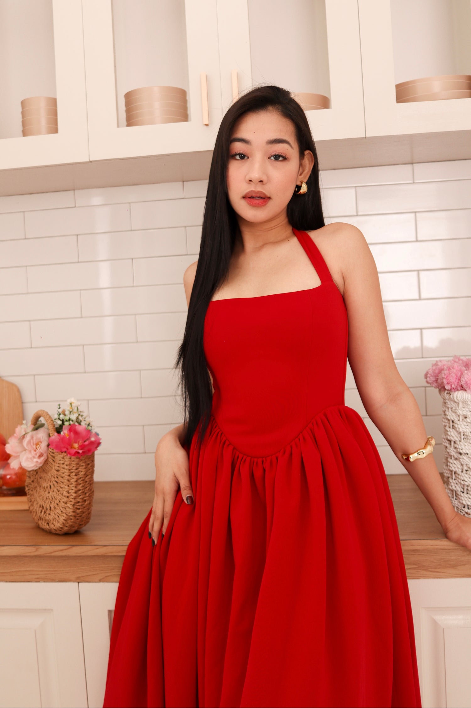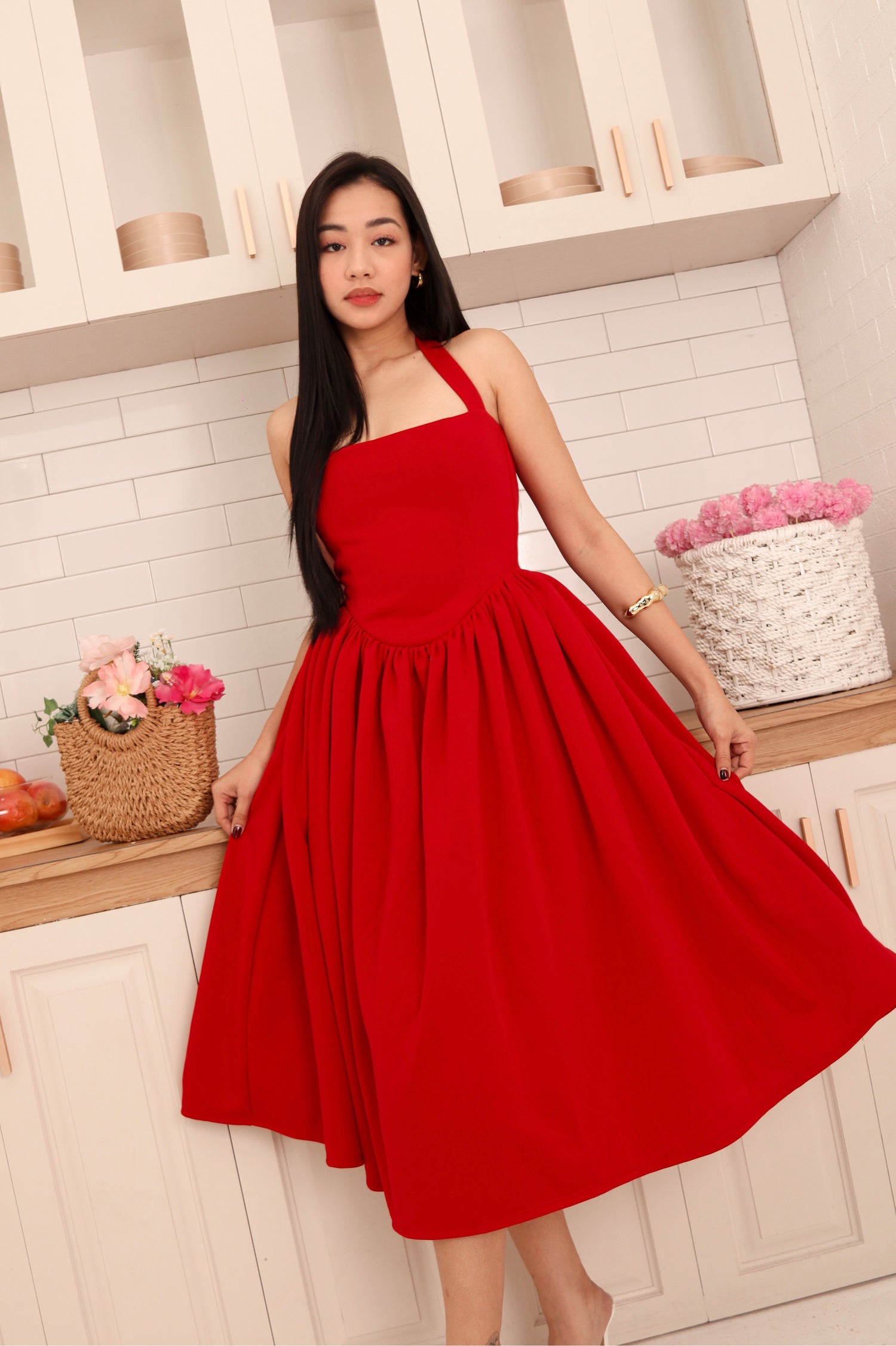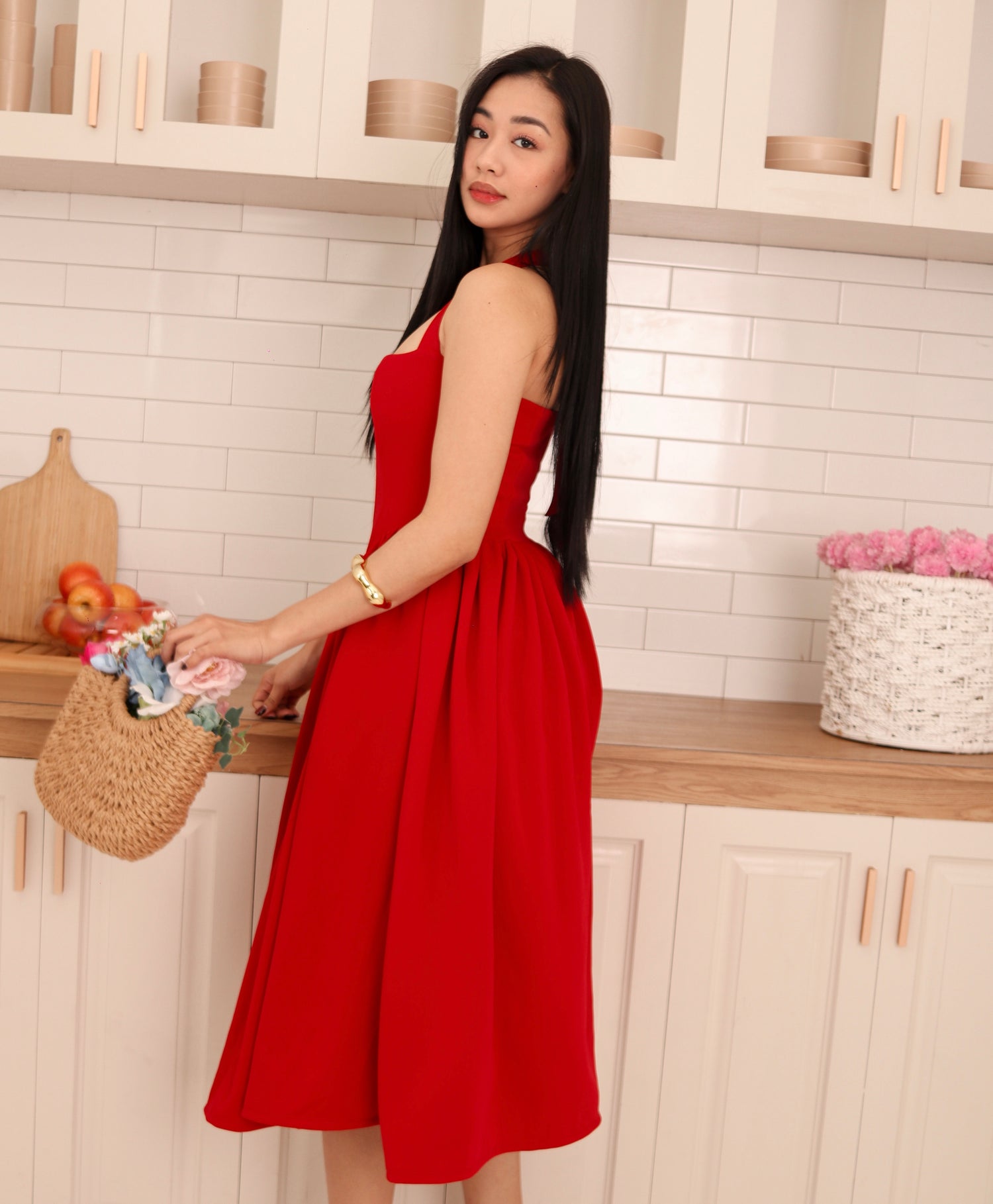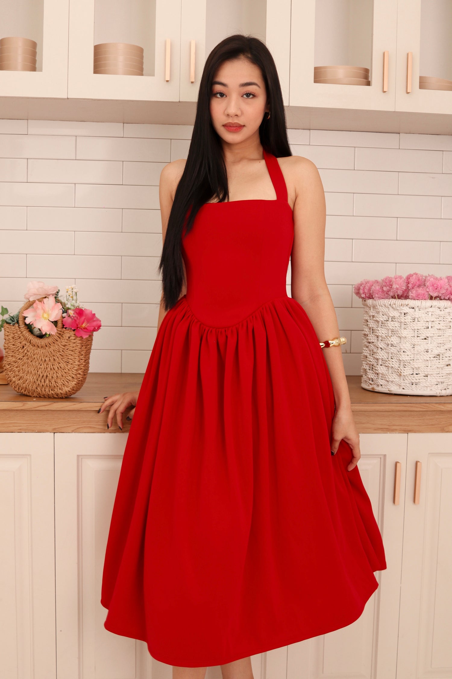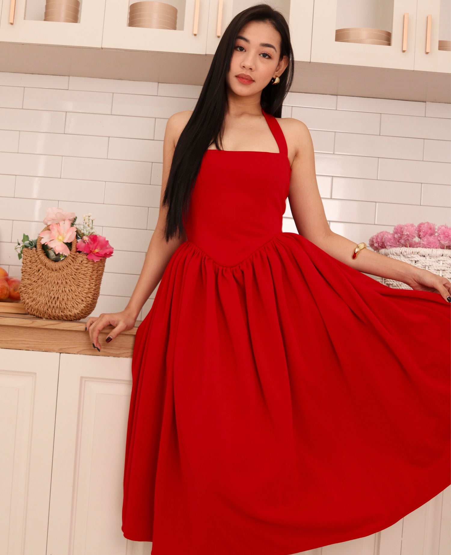 The Tove Midi Dress exudes classic romance with a modern edge. Designed with a corset-inspired drop-waist bodice and a graceful full skirt, it creates a beautifully balanced silhouette. The straight neckline is framed by adjustable halterneck straps for a customizable fit, while a built-in tulle petticoat adds soft volume and subtle drama. A timeless piece made for moments that call for quiet elegance.